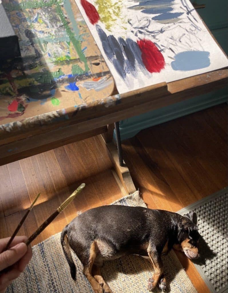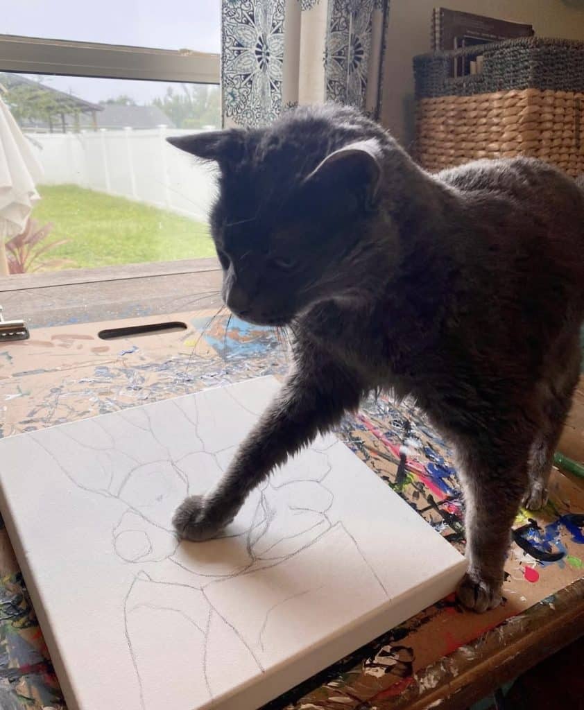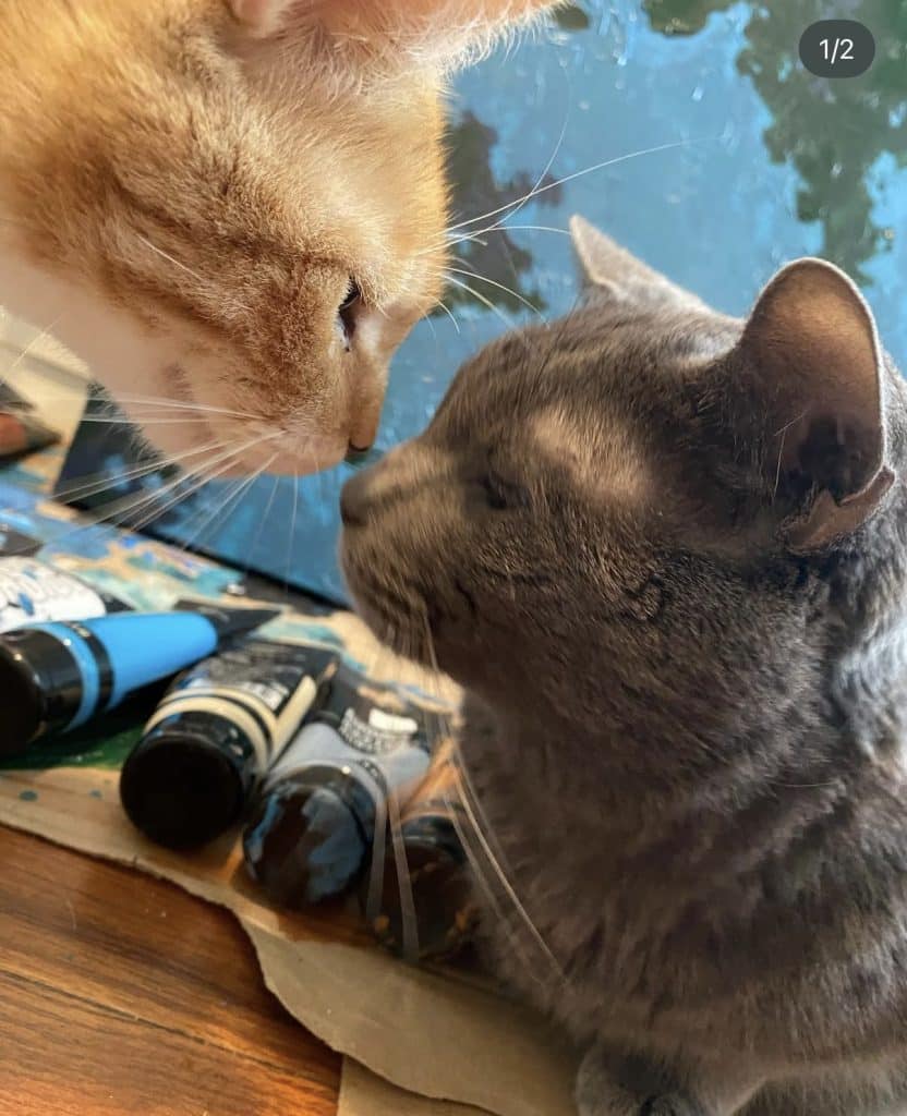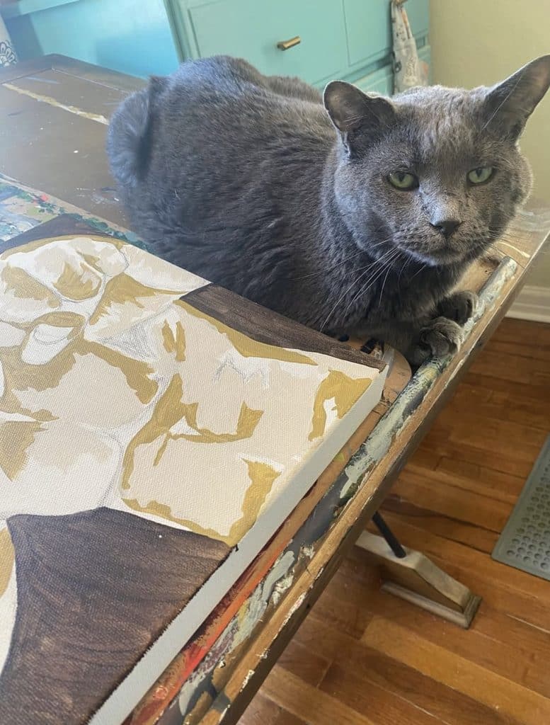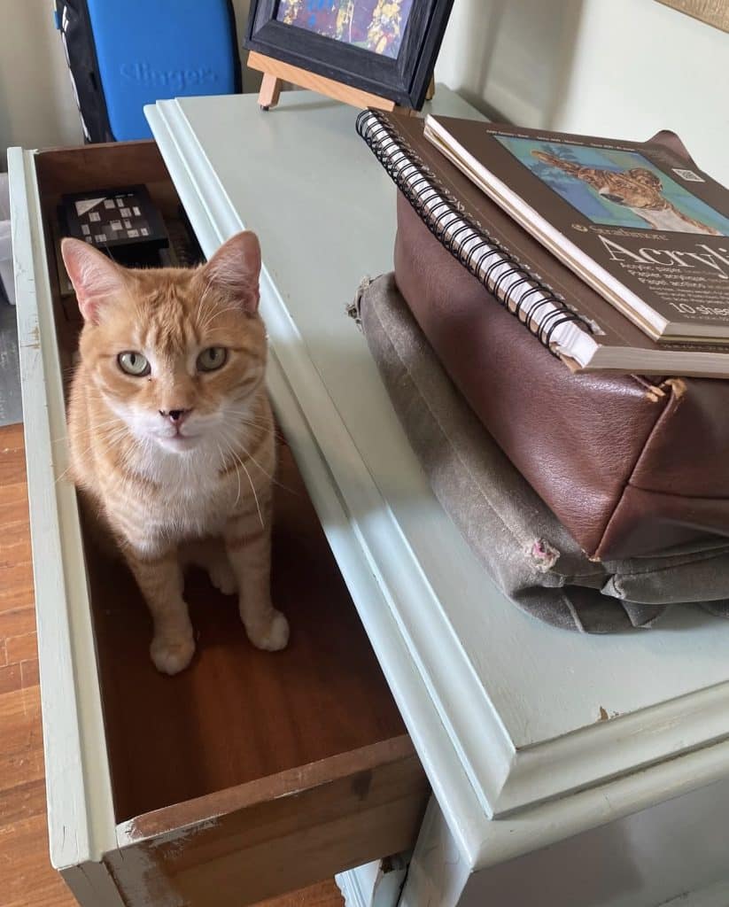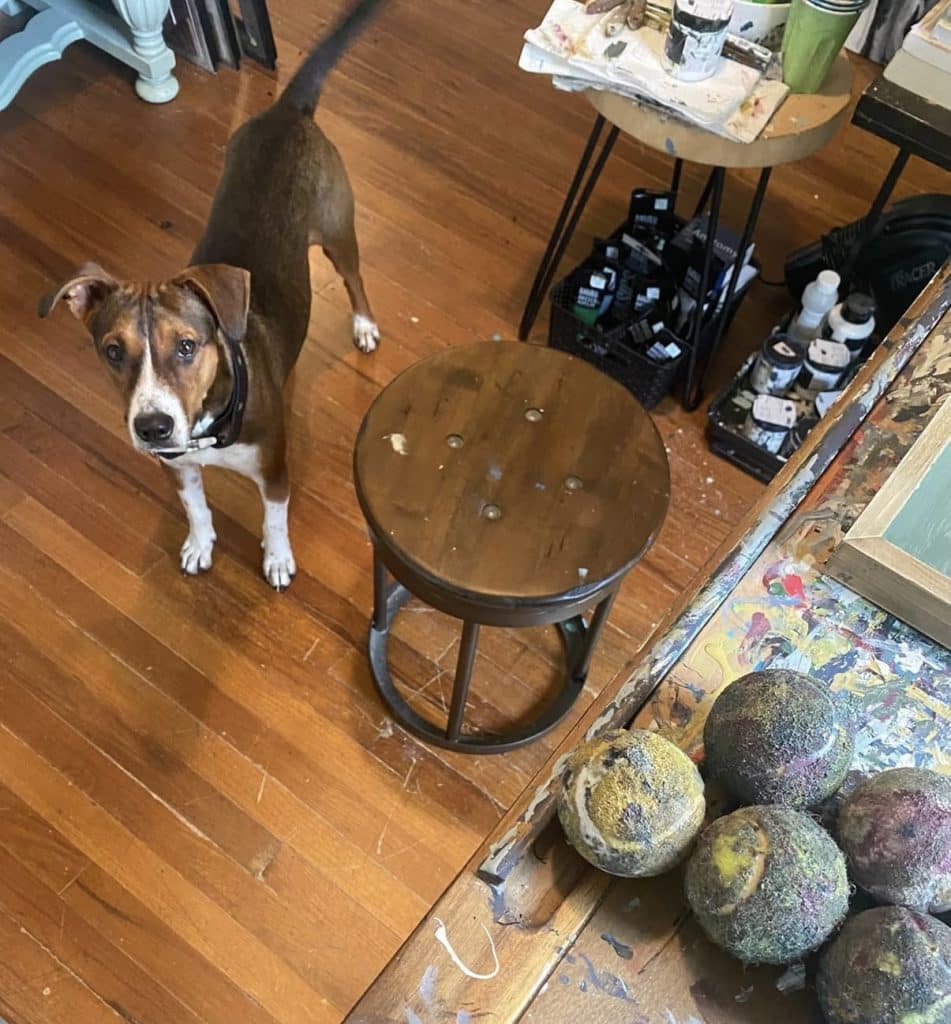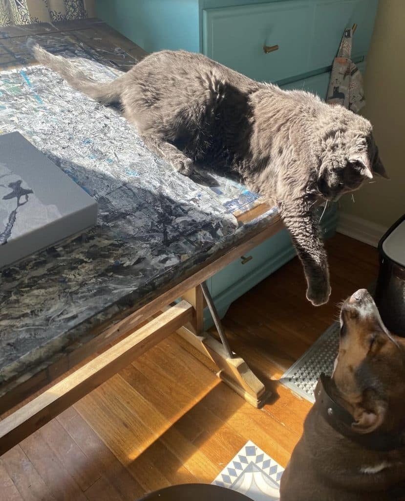 My art studio is shared with whatever family pet happens to be wandering in, crawling around, or watching intently.  All our animals are boys, and all are rescues: Buster and GOB (both Russian Blue cats), Simon (orange and white tabby), plus our silly mutt, Dexter.  Our beloved rescue chiweenie mix, Tank, would often keep me company throughout the artistic process.  Our pets are such an integral part of the family that their presence inside the creative space is always welcome.  These boys prompt me to step back, look at things from a different angle, and appreciate the process-over-product frame of mind when creating.  This little studio spot has witnessed every step of every original piece of art since the summer of 2018 when we moved in and began making memories.