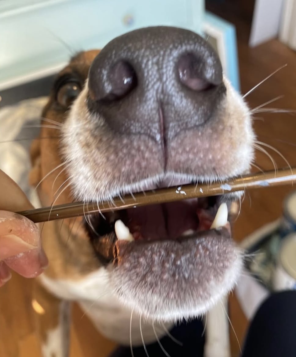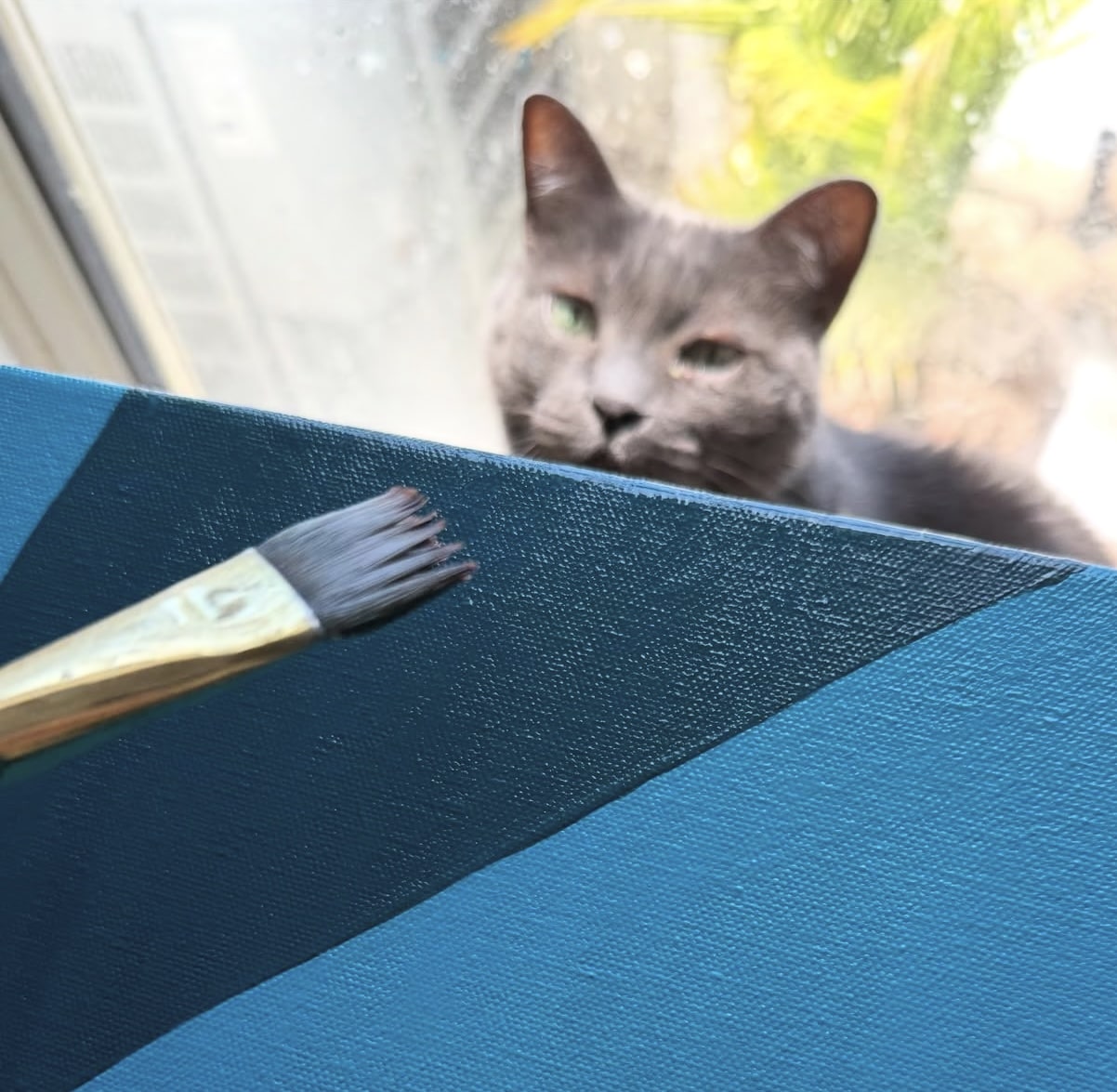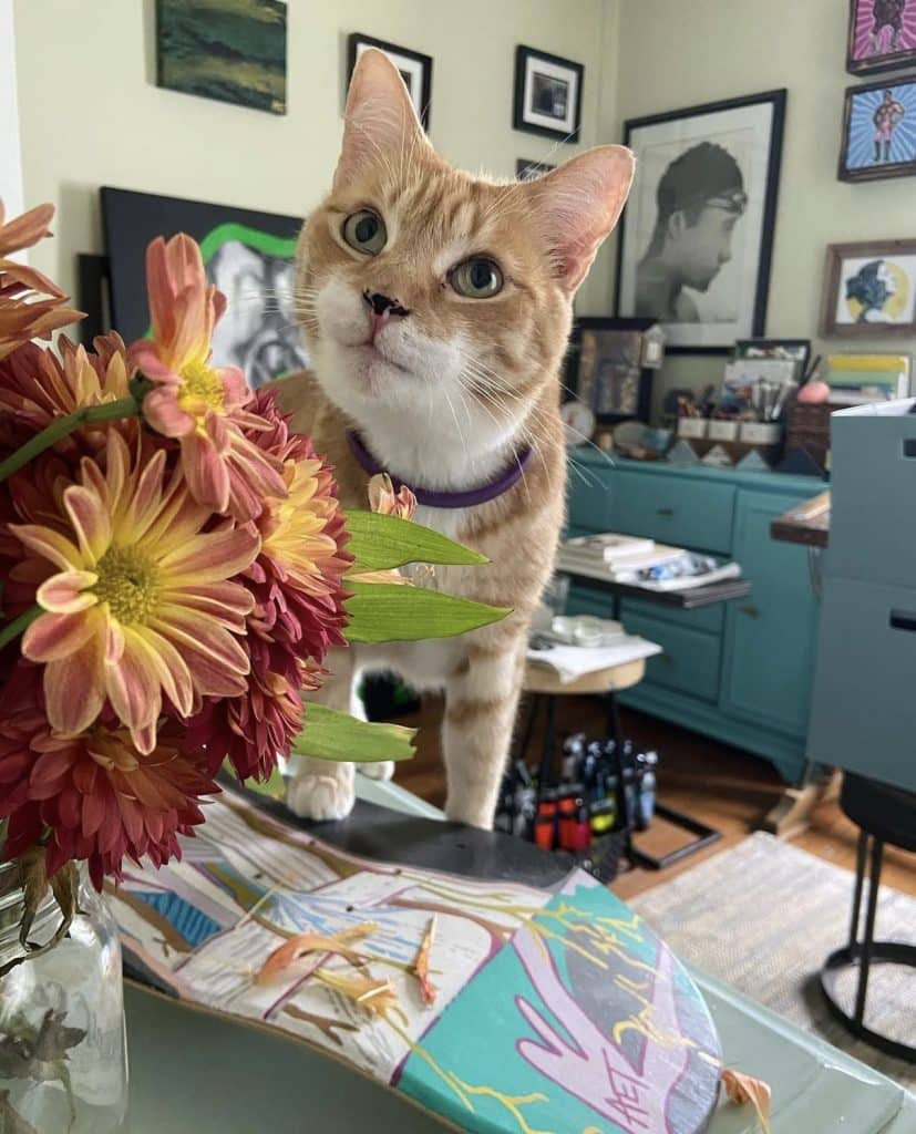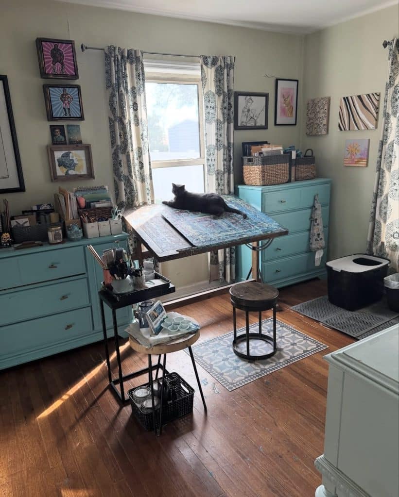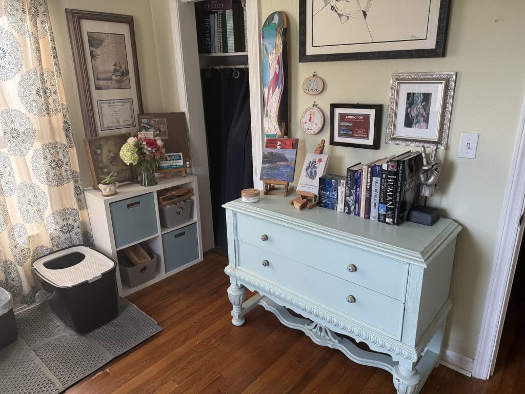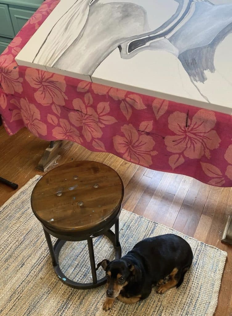 My art studio is shared with whatever family pet happens to be wandering in, crawling around, or watching intently.  All our animals are boys, and all are rescues: Buster and GOB (both Russian Blue cats), Simon (orange and white tabby), plus our silly mutt, Dexter.  Our beloved rescue chiweenie mix, Tank, would often keep me company throughout the artistic process.  Our pets are such an integral part of the family that their presence inside the creative space is always welcome.  These boys prompt me to step back, look at things from a different angle, and appreciate the process-over-product frame of mind when creating.  This little studio spot has witnessed every step of every original piece of art since the summer of 2018 when we moved in and began making memories.