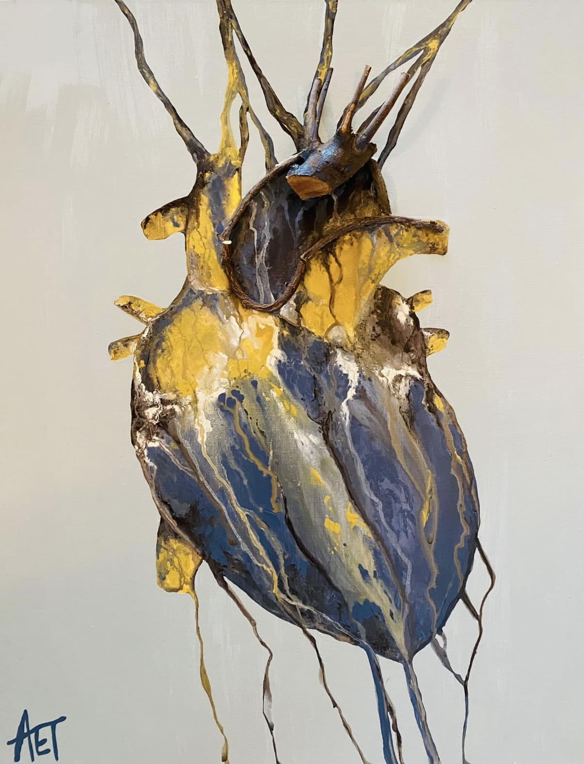 As for the logo, the real magic originated from a creative designer who I had the pleasure of working with.  We collaborated on utilizing the general, simplified contour of the human heart, tweaking it into a semi-abstract, semi-geometric stylish design.  My art logo focuses not on precise anatomical details or specific conditions but appropriately displays lines and patterns in a balanced manner.  This overall balance and attention to aesthetics is a nod to the heart as a powerful force that keeps going strong.  To drive that point home, my AET (Anne Elsea Thrift) initials, taken from my actual artist signature is added as a key component and significant feature.  The AET addition fits strategically into the left ventricle, a chamber of the heart that pumps oxygenated blood through the aortic valve and into the aorta (the body’s main artery) then distributes blood to the rest of the body.  The left ventricle is larger and has thicker walls than the right ventricle.  Placement of my AET initials into the left ventricle seemed fitting and a symbolic way to present “original art from the heart.”