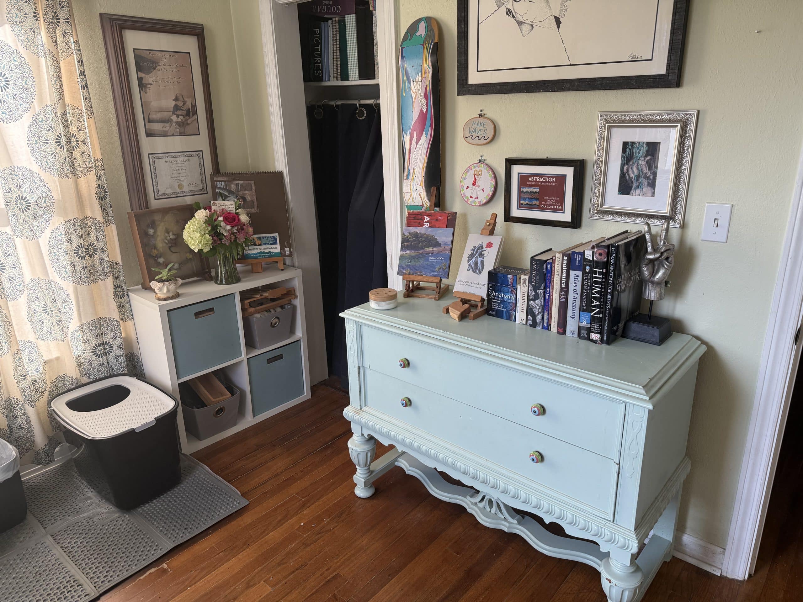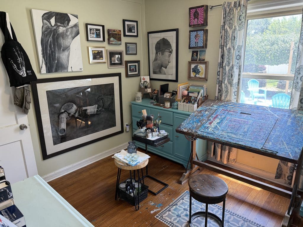 Having a dedicated space for my artistic endeavors is such a gift.  This cozy 9’ x 12’ room, complete with two small windows overlooking the backyard, is officially the home art studio.  It gets great natural light and is one of the few rooms of our historic 1946 brick cottage that preserved its original hardwood floors.  My studio space is not a glamorous one designed to impress but rather a functional, eclectic, energizing one fitted for self-expression.  Music is playing through the speaker, phone is put away and on silent, scented candle is burning, and coffee or tea is consumed.  The walls are adorned with a myriad of artwork, including some of my own originals but also artsy gifts from friends and pieces from fellow artists who I follow and admire.  Every item has its place, and every piece has meaning.
