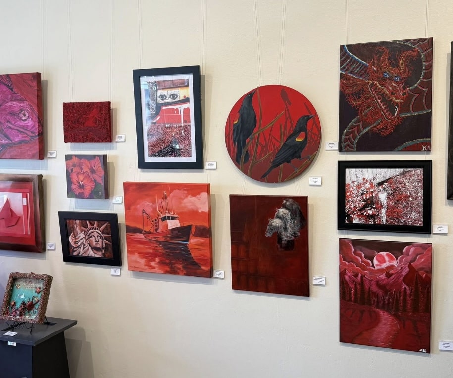 Gallery of Art (GOA) extends periodic call-to-artists offerings, encouraging local artists to create an original piece that exemplifies a particular theme. GOA’s seasonal themed exhibits allow a wide array of creative interpretations and representations and promote self-expression. Happy to participate in the All About Love show with a painting titled Outpouring. Also delighted to have an original painting, You’re Gonna Need a Bigger Bite, be chosen for The Color Red show.